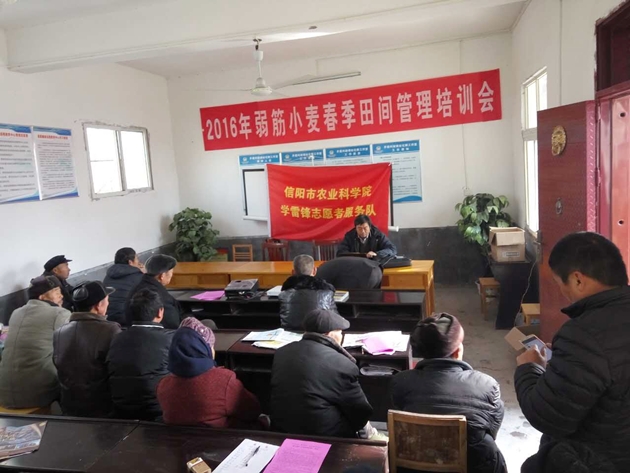 服務(wù)隊到達該村后,立即對早已等候多時(shí)的村民開(kāi)展了培訓工作,國家小麥產(chǎn)業(yè)技術(shù)體系信陽(yáng)試驗站站長(cháng)陳金平研究員作了題為《當前小麥生產(chǎn)田間管理技術(shù)》和《弱筋小麥高產(chǎn)高效生產(chǎn)技術(shù)》的技術(shù)培訓,指出了該村當前小麥生產(chǎn)中存在的問(wèn)題并給出了解決辦法。當前小麥生產(chǎn)中的主要問(wèn)題:一是由于連續陰雨,部分小麥沒(méi)能如期播種;二是受地下水位高的影響,部分田塊麥苗長(cháng)勢較弱;三是缺苗斷壟較重。針對上述問(wèn)題,可采取以下辦法:一是搶時(shí)播種,可以催芽后再播,同時(shí)要加大播量;二是及時(shí)清溝排漬,起好田間“四溝”,并對長(cháng)勢偏弱的酌情施肥;三是及時(shí)查漏補缺。培訓會(huì )結束后,科技專(zhuān)家自愿者服務(wù)隊又到田間實(shí)地查看了麥苗的長(cháng)勢,并針對不同情況分別提出了實(shí)施意見(jiàn)。