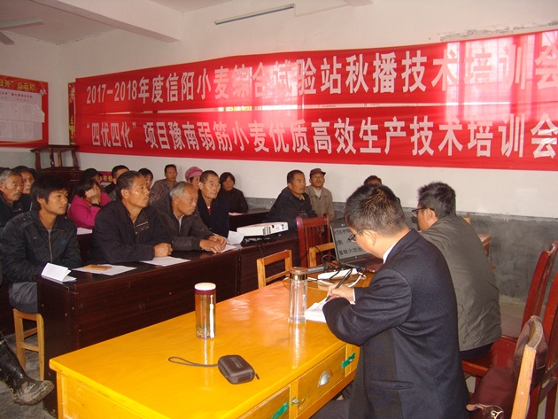 李宇峰研究員在會(huì )上作了題為《豫南小麥高產(chǎn)栽培技術(shù)要點(diǎn)及當前生產(chǎn)上應注意的問(wèn)題》的技術(shù)培訓,指出了當前小麥播種時(shí)應注意的問(wèn)題,并詳細講解了弱筋小麥栽培技術(shù)、豫南小麥高產(chǎn)栽培技術(shù)要點(diǎn)以及小麥主要病蟲(chóng)害綜合防治技術(shù)。培訓會(huì )結束后,李宇峰研究員向大家表示,今年我省提出要以“四優(yōu)四化”為主線(xiàn)大力推進(jìn)農業(yè)供給側結構性改革,加快建設現代農業(yè)強省,其中建立優(yōu)質(zhì)小麥高產(chǎn)生產(chǎn)示范基地是信陽(yáng)農業(yè)生產(chǎn)的一項重要內容。息縣是全省乃至全國弱筋小麥適宜種植區域,發(fā)展前景廣闊。市農科院今年已將張老莊村納入“四優(yōu)四化”科技支撐行動(dòng)計劃,將在該村建立百畝弱筋小麥示范方,由我院統一供種,統一提供技術(shù)方案與跟蹤服務(wù),統一組織農機操作,統一進(jìn)行病蟲(chóng)害綜合防治。