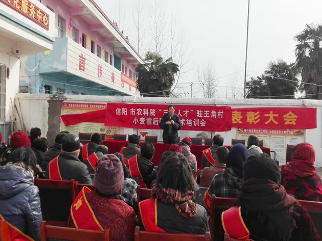 調研期間,陳金平研究員還在王角村召開(kāi)了小麥雪后田間管理的技術(shù)培訓會(huì ),從凍害補救、清溝降濕、化學(xué)除草、及早追肥等方面為大家上了一堂精彩的培訓課,參加培訓會(huì )的種田大戶(hù)、農戶(hù)、技術(shù)骨干、領(lǐng)導等60多人次。