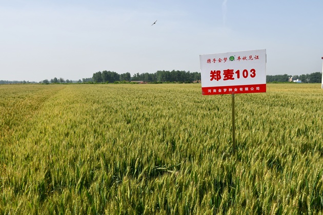 鄭麥103是河南省農業(yè)科學(xué)院小麥研究所豐優(yōu)育種室育成的高產(chǎn)穩產(chǎn)、抗病抗逆小麥新品種,高抗條銹病,中抗葉銹和紋枯病病,中感白粉和赤霉病。從現場(chǎng)觀(guān)摩的情況來(lái)看,鄭麥103在本年度氣候異常、雨水偏多所有病害均大發(fā)生的年份確實(shí)經(jīng)受住了考驗,萬(wàn)畝示范區內小麥長(cháng)勢蔥籠、群體大、穗大粒多,幾種常見(jiàn)病害均未發(fā)生,其過(guò)硬的抗病性和抗逆性令在場(chǎng)所有專(zhuān)家折服。據現場(chǎng)多點(diǎn)實(shí)測估產(chǎn),萬(wàn)畝示范方平均畝穗數在40萬(wàn)左右、在穗粒數30粒左右,平均畝產(chǎn)超千斤。