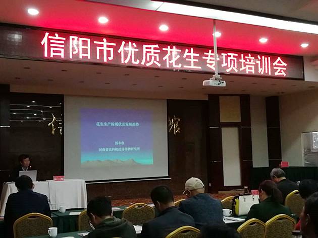 3月31日—4月1日,信陽(yáng)市優(yōu)質(zhì)花生專(zhuān)項培訓會(huì )在信陽(yáng)賓館召開(kāi),河南省“四優(yōu)四化”優(yōu)質(zhì)花生專(zhuān)項負責人、國家花生產(chǎn)業(yè)體系崗位科學(xué)家湯豐收研究員等專(zhuān)家一行5人到會(huì )授課。市農科院副院長(cháng)祁玉良出席會(huì )議并致辭。我市各縣區農業(yè)技術(shù)人員、花生種植大戶(hù)、花生專(zhuān)業(yè)合作社代表、花生加工龍頭企業(yè)等80多人參加了培訓會(huì )。