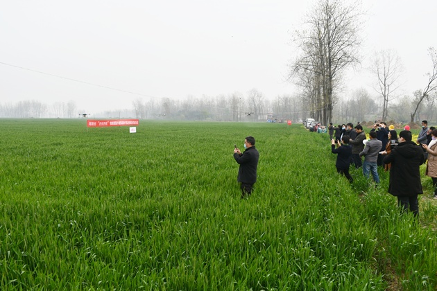 活動(dòng)現場(chǎng),與會(huì )人員現場(chǎng)觀(guān)摩了人工配藥和植保無(wú)人機噴灑作業(yè)展示,5臺無(wú)人機同時(shí)作業(yè),只用5分鐘的時(shí)間40畝麥田就噴灑完畢,體現出了極高的工作效率和極佳的防治效果;顒(dòng)現場(chǎng)還為種田大戶(hù)們發(fā)放信陽(yáng)麥田中后期管理技術(shù)資料200余份。