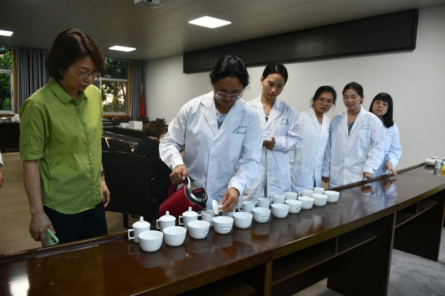 為直觀(guān)貼切反映茶葉審評重要性,我院技術(shù)團隊人員選取各具特色的13個(gè)綠茶樣及12個(gè)紅茶樣作樣板,按專(zhuān)業(yè)審評流程同省院專(zhuān)家一起交流學(xué)習,從條索、嫩度、色澤、整碎、凈度、香氣、滋味、湯色、葉底等給出專(zhuān)業(yè)點(diǎn)評。省院領(lǐng)導專(zhuān)家表示,不虛此行收獲良多,下一步將在信陽(yáng)主要產(chǎn)茶縣區抽取茶樣用于實(shí)驗檢測。