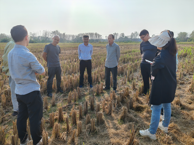 在商城、羅山、光山,試驗站團隊與示范縣技術(shù)骨干仔細查看示范基地土壤墑情、綠肥出苗、田間秸稈等情況。我院資環(huán)所所長(cháng)、試驗站站長(cháng)呂玉虎研究員指出,今年綠肥播種季節天氣較旱,綠肥出苗困難,有條件的地方要及時(shí)灌跑馬水,確保苗齊苗全。為了應對極端氣候,確保綠肥高產(chǎn)穩產(chǎn),綠肥播種時(shí)應采用無(wú)人機稻底套播,既提高播種質(zhì)量和效率,又有利于出苗。水稻收獲時(shí)不能離田的秸稈要留高茬,減少稻草覆蓋引起的缺苗現象。并采取開(kāi)溝、追施磷肥等技術(shù)措施。