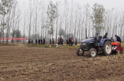 10月21日,信陽(yáng)市小麥高產(chǎn)創(chuàng )建機條播現場(chǎng)觀(guān)摩會(huì )在息縣孫廟鄉龍廟村召開(kāi)。市農科院,息縣政府辦、農業(yè)局、農科所等單位負責同志和專(zhuān)家,以及息縣各鄉鎮農業(yè)技術(shù)人員、種糧大戶(hù)代表40余人參加了會(huì )議。與會(huì )人員實(shí)地參觀(guān)了息縣孫廟鄉龍廟村小麥機條播現場(chǎng),一到現場(chǎng)大家就被田間的大型機械吸引,兩臺條播機在田間穿梭,一會(huì )功夫一塊十畝左右的稻茬麥田就播種完畢,一次作業(yè)完成滅茬、淺旋、開(kāi)槽、施肥、播種、覆土、鎮壓等6道工序,省工節本、效率高,播種量易于控制,且入土深淺一致,分布均勻,利于高產(chǎn)穩產(chǎn)。秸稈全量還田的,先深旋滅茬一遍再進(jìn)行機條播以確保播種質(zhì)量。播種間隙,與會(huì )人員對這種先進(jìn)的機械紛紛表示了濃厚的興趣,不時(shí)地撫摸機械,研究其原理,并熱切地討論,對信陽(yáng)小麥生產(chǎn)發(fā)展充滿(mǎn)了信心。
